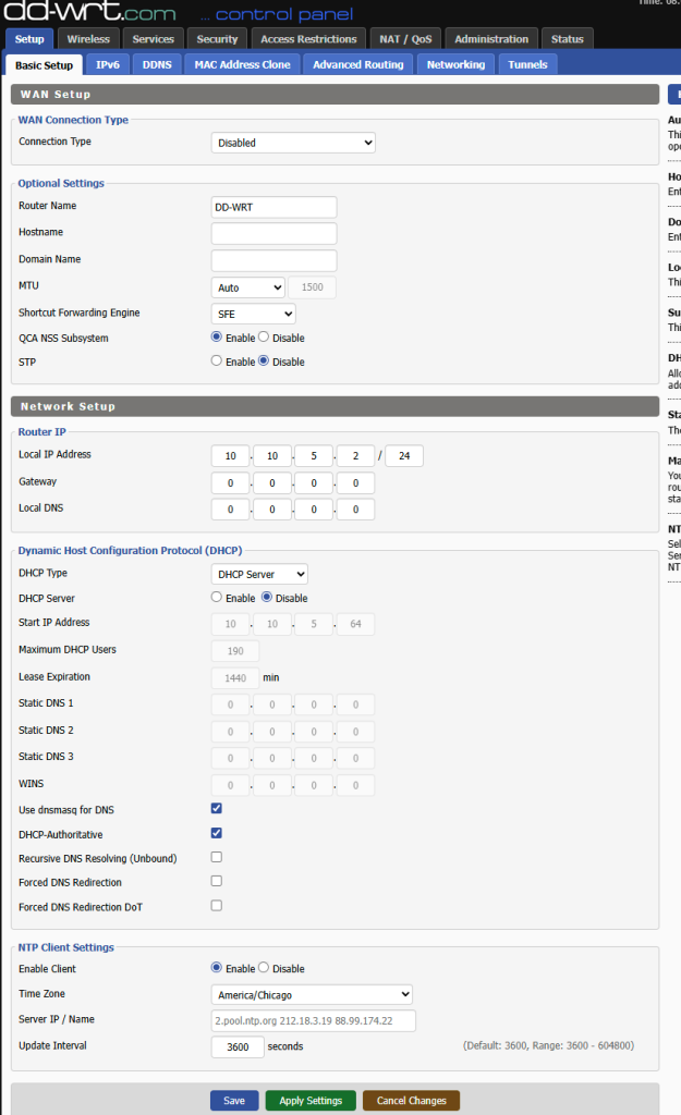 Since this is my main WAP device, the IP settings will be different than what we set up above. For illustration purposes, I’ll share here the actual IP configuration page as it is currently configured. These should be changed to reflect your own configuration.