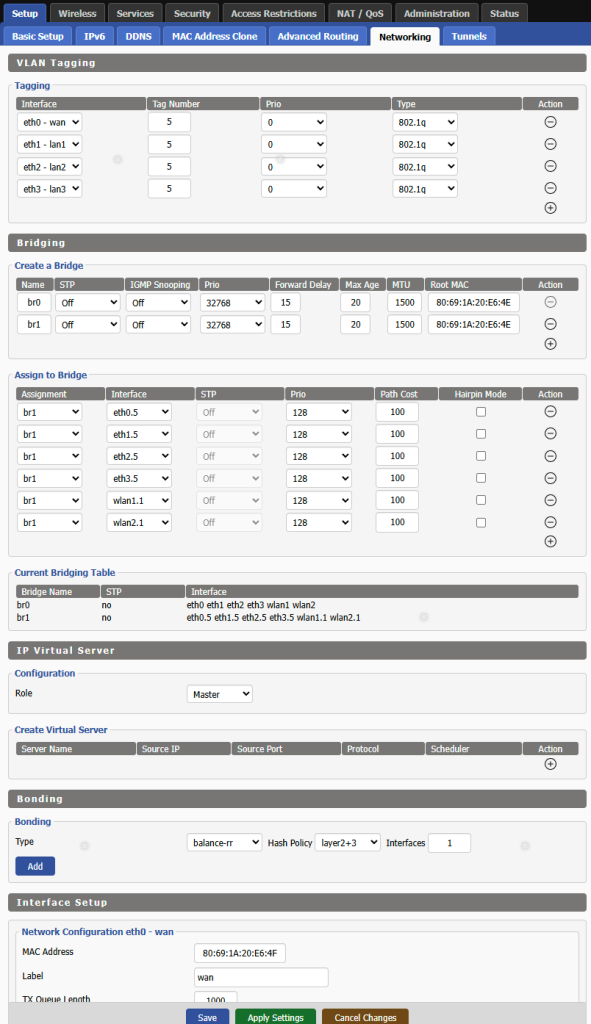Once these are set up, we’ll go in te main Setup tab of DD-WRT’s web interface and select the Networking tab. Here you will notice taht I’ve tagged all phsyical interfaces with VLAN 5, so that tagged traffic passes through. They essentially become trunks carrying VLAN 5 only, in this case. Recall this is strictly a router running in dumb AP mode, simply serving as a wireless interface to the LAN and my isolated VLAN 5 with VPN access.