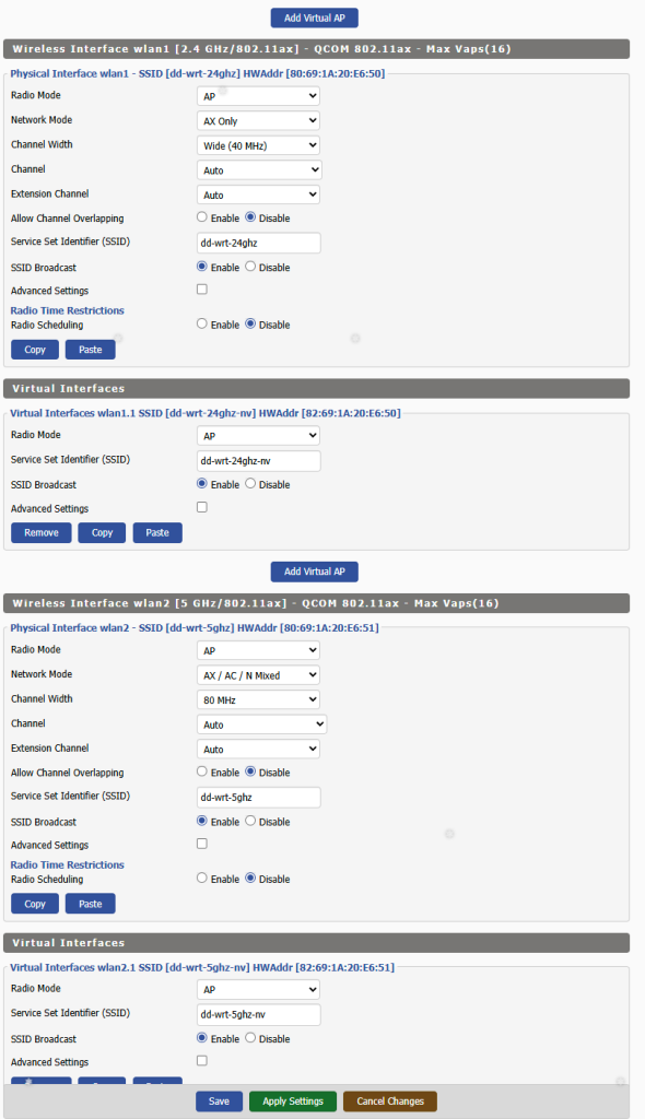 For the other 2 wlan interfaces that are enabled, I’ve added an additional Virtual AP, which essentially provides a separate virtual Wifi interface to connect to. You can tell them apart from the added “-nv” to the default, LAN accessible SSID to signify NordVPN. One runs on the 2.4 Ghz radio frequency range, and the other in the faster, but less penetrable 5 Ghz frequency. The only major modification here is that I’ve let them use full channel width. This is optional.