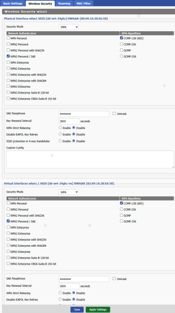 The next screenshot shows the Wireless Securty settings. These are pretty generic, WPA3 with a supplied password. You will notice the virtual sub interface is named wlan1.1 and wlan2.1 respectively. Not fully visible in this partial screenshot.
