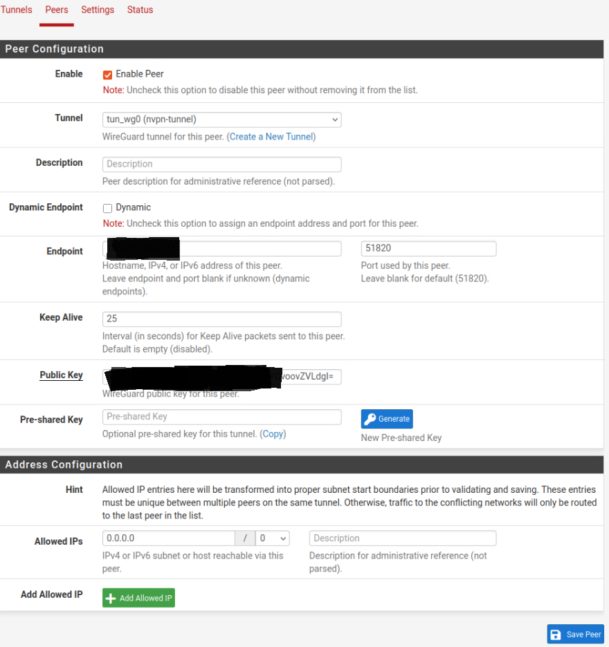 Enter the Public Keyfrom the “peer” section of the saved configuration into the proper field and under Allowed IPs enter 0.0.0.0 and select 0 for the CIDR subnet mask. Make sure to check “Enable Peer” and click Save.