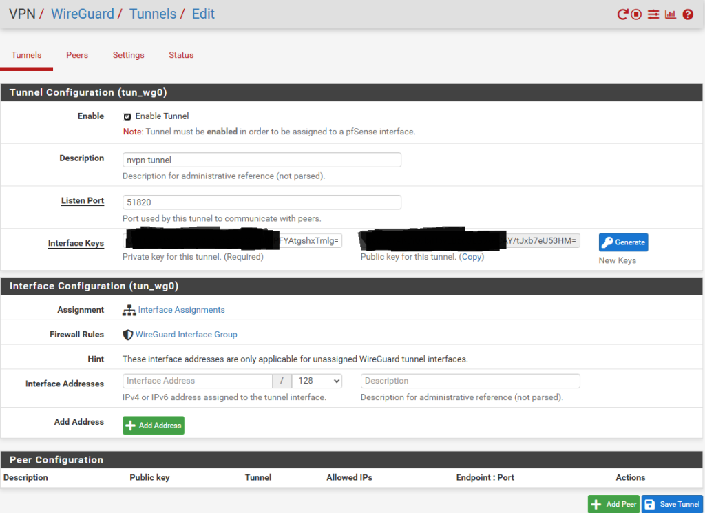 Next click on the Peers tab and click Add Peer. Under Tunnel, select “tun_wg0” that corresponds with the just-created tunnel, uncheck Dynamic to make the fields accessible and enter the IP address from the configuration copied earlier in the Endpoint field.