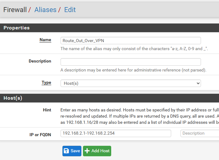 Click on Firewall, Aliases, + Add, and enter a descriptive name (I chose “Route_Out_Over_VPN”), and in the “IP or FQDN” field enter the desired subnet range. In my case, that’s 192.168.2.1-192.168.2.254. Click Save.