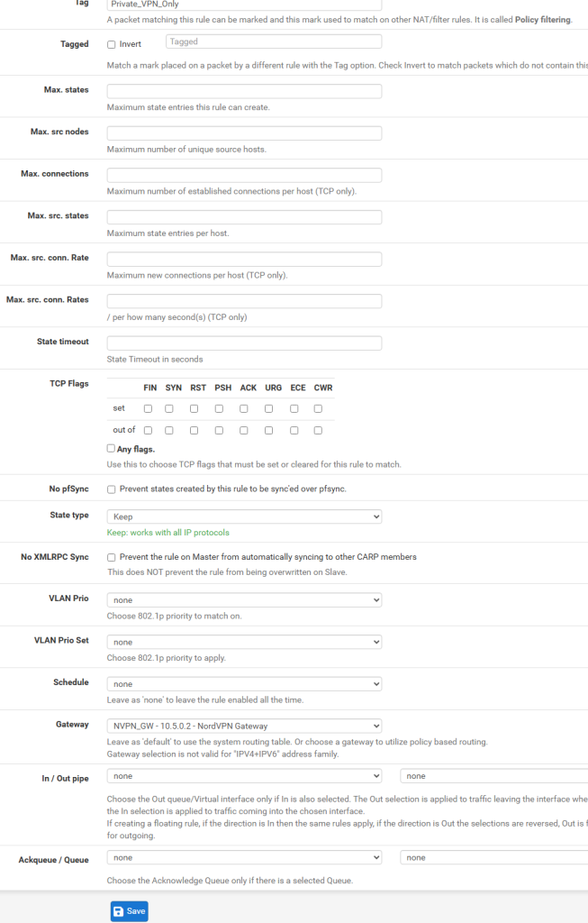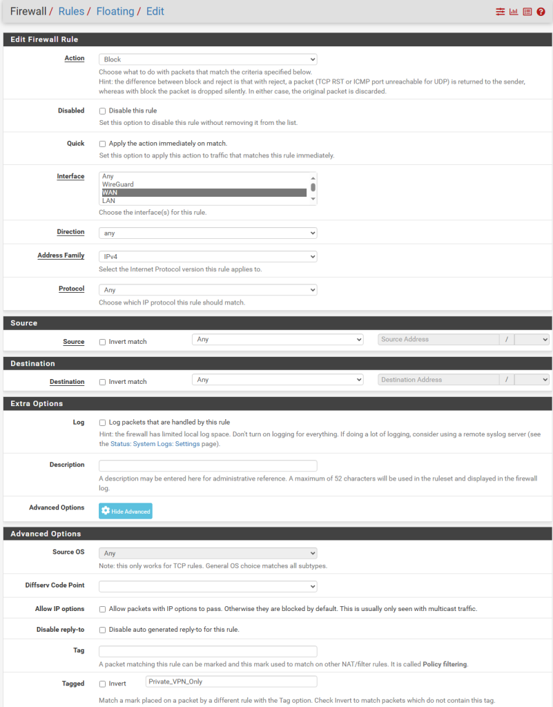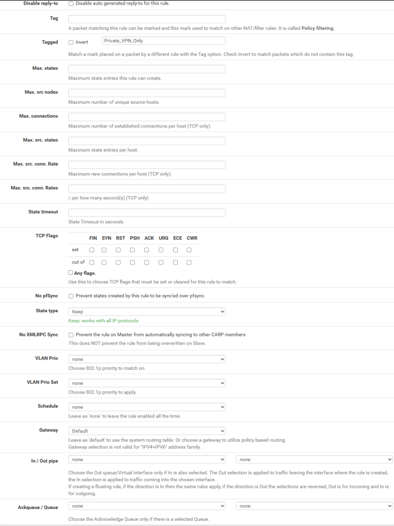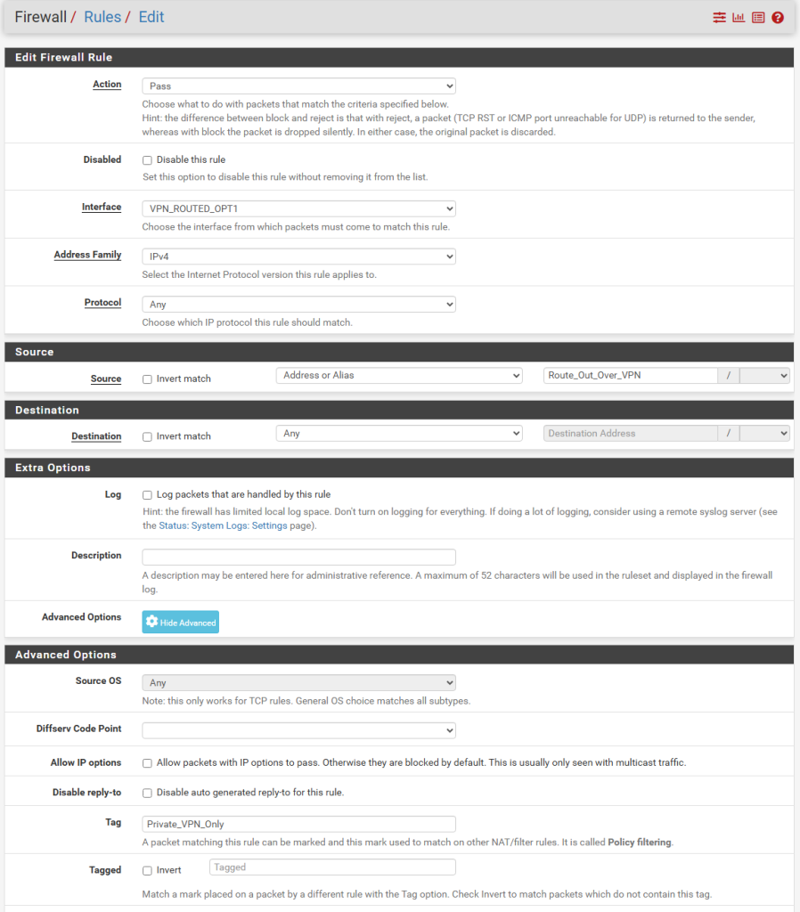 Click Display Advanced button and under Tagged (not Tag – we’re looking for already tagged packets at this step), paste the tag we used earlier. My example is “Private_VPN_Only”. Click Save.