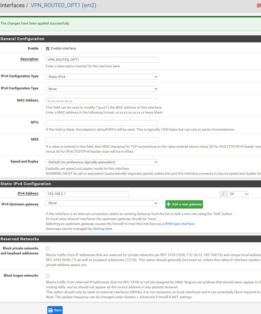 Click on Interfaces in the top pfSense menu bar and click the new interface to configure a new subnet(work) that you will configured to handle your new VPN-routed traffic. Here we need to assign it an IP address, the CIDR subnet range (/24 for my use, the equivalent of 255.255.255.0 subnet mask). Since my main LAN network in this demo is 192.168.1.0/24, this new network will be 192.168.2.0/24.