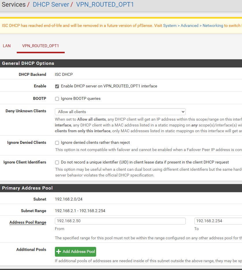 This is probably a good time to set up the DHCP server for this new routed interface. Click Services, DHCP server, select your newly assigned VPN-routed interface (hopefully you named it something beyond OPTx for easier identification), click Enable DHCP server… at the top,