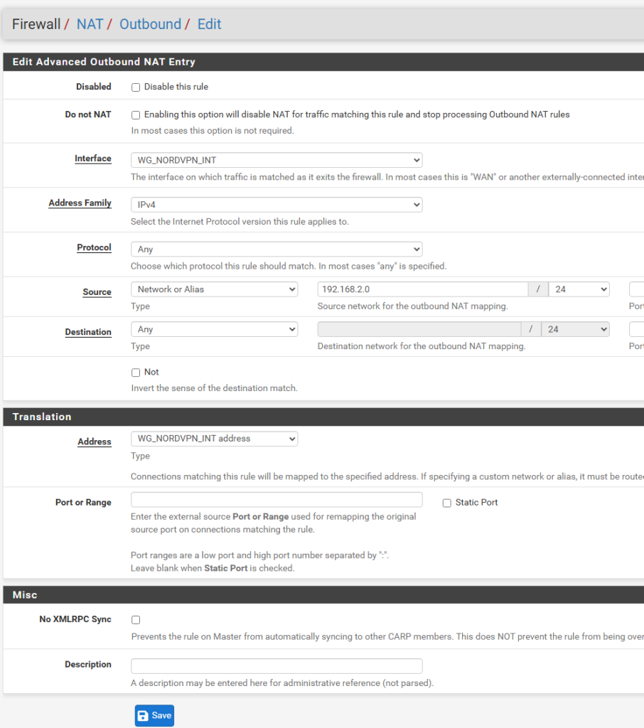 In the Translation section, under Address, select the Wireguard assigned interface address from the list (mine is called WG_NORDVPN_INT address”. Click Save.