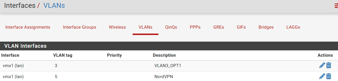 I’ve create a bridge called br1 in addition to the default br0 bridge and bridged all .5 (VLAN 5 tagged) subinterfaces together. In addition, i’ve added the two wireless virtual interfaces to the bridge as well. This does the magic that bridges every device that connects to my -“nv” labeled Wifi SSIDs to my VLAN 5 isubnetwork in pfSense and gets served an IP address from there and is routed out over the VPN connection we created early on.