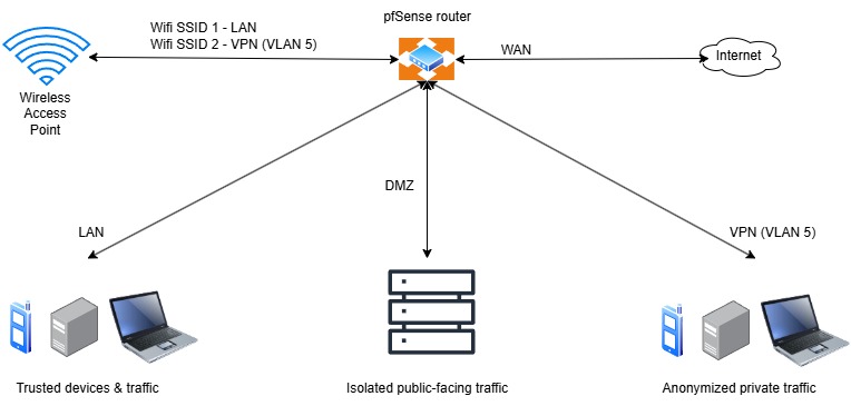 A summary of my network configuration allowing isolated and private Internet access to specific networks behind a pfSense router and a Wireguard VPN, utilizing VLANs, firewall rules for isolating traffic and routing traffic out to my VPN provider. Complete with a VPN kill switch and Wireless Access Point configuration using a custom-flashed DD-WRT router running in Wireless AP mode.