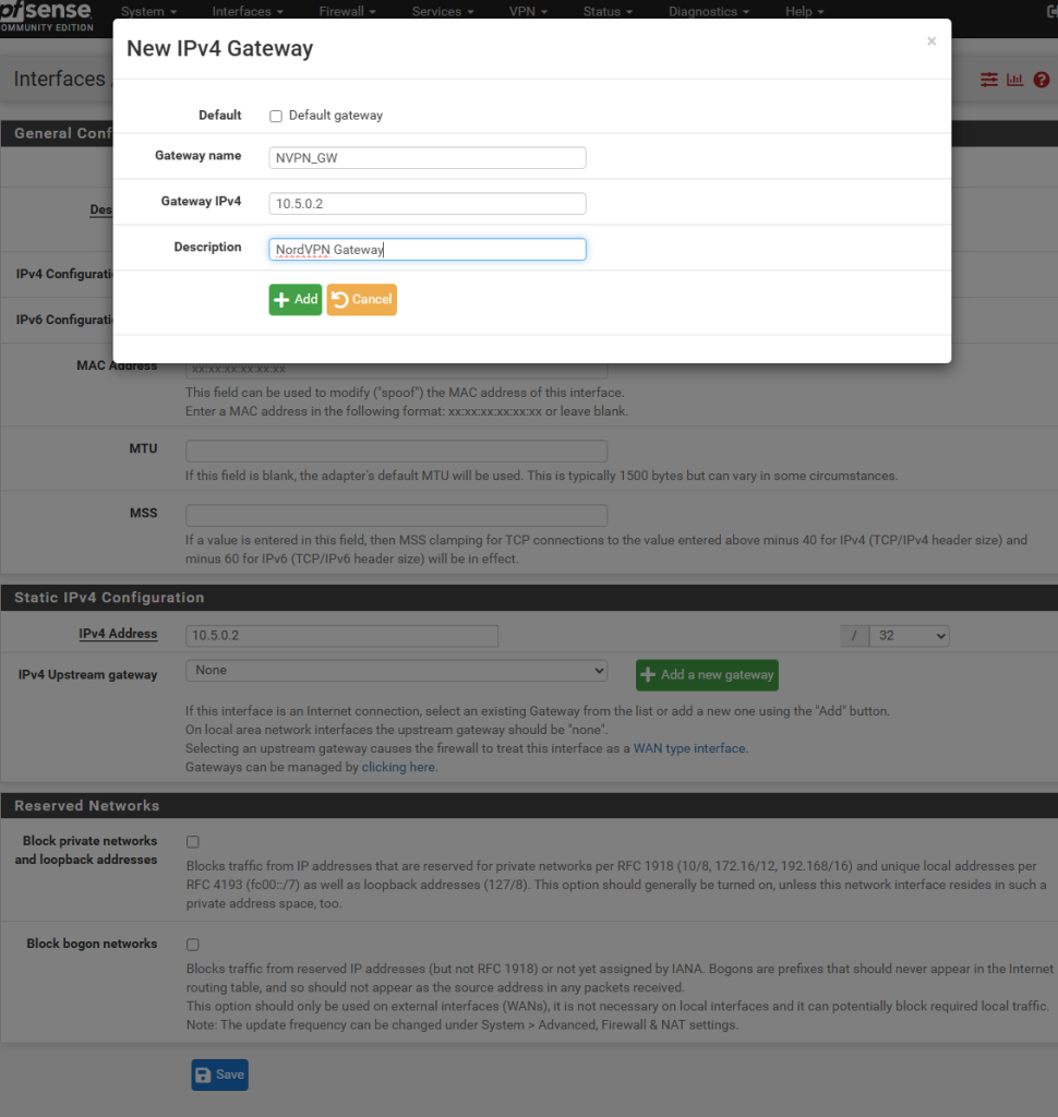 In the IPV4 upstream gateway, click “+ Add a new gateway”, optionally rename to something more descriptive, and enter 10.5.0.2 in the Gateway IPV4 field. (The same as the IP entered in the Interface IPV4 address prior. Click +Add. Then Save and Apply.. NordVPN uses 10.5.0.2 for the tunnel interface address, which can be seen in this Windows configuration screenshot.