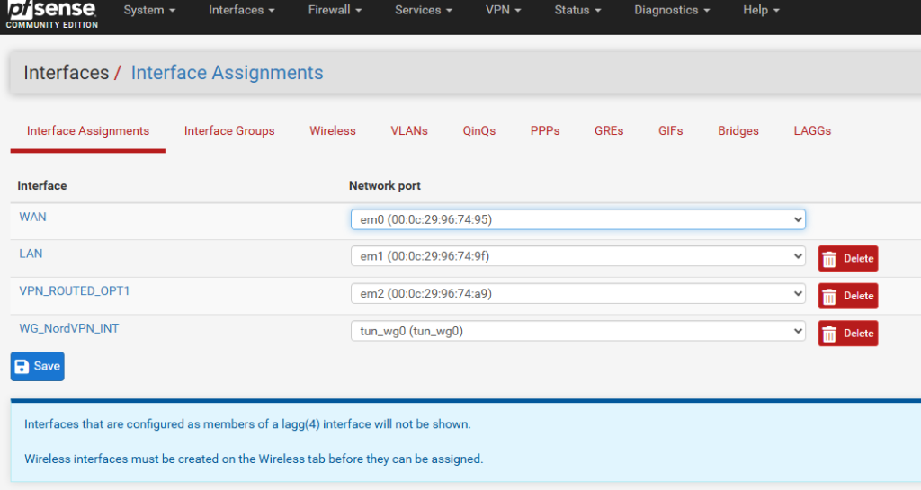 Select the newly created interface from the Interfaces menu (mine was OPT2 by default), and click the “Enable interface” checkbox. In IPV4 Configuration Type drop down menu, select Static IPV4 and in the IPV4 address field, enter the IP Address 10.5.0.2/32 I renamed the description field _WG_NordVPN_INT for easy identification.