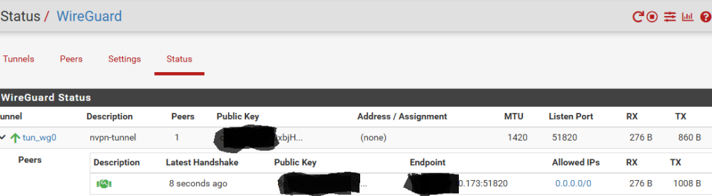 The service should start automatically and connect, but if it doesn’t, you can click the little > “play button” at the top right corner of this page to start the Wireguard service.. Verify that the peer has connected through the tunnel interface you created: